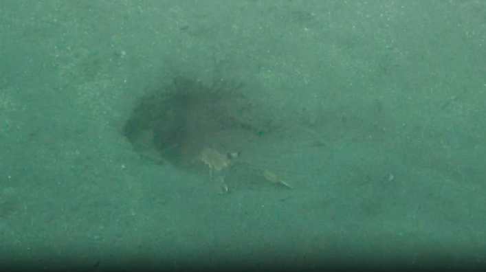 Figure 2: A Nephrops norvegicus emerging from its burrow, a still of the video material gathered at the SmartBay Observatory in February 2026. Credits: Marine Institute